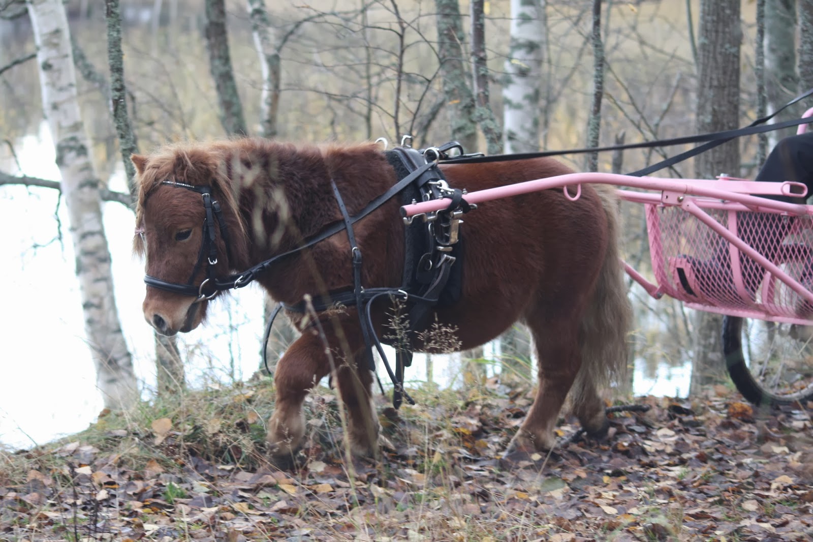 Treenit ollaan aloitettu ajo-opetuksen ja kesälomailun jälkeen aika helposti. Narun perässä lenkkeilyä ja mäkihölkkää, kärryttelyä ihan normaalsiti suoralla tiellä ja ohjasajaen treenaten kaarevia uria. Lumien tultua päästään molempien lempihomman käsiin, nimittäin hangessa tarpomiseen! Mikään ei ole parempaa treeniä [ei ponille eikä taluttajalle..] kuin tunnin lenkki polveen asti yltävässä hangessa! Huh. Pakkasten tulo tarkoittaa myös "kentän" käyttöönottoa, joten ehkäpä kohta päästään vähän edistymään!